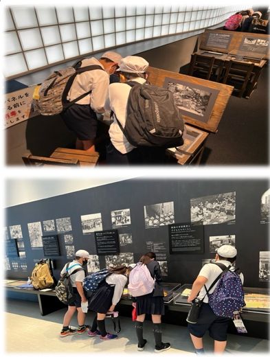 6年生が、社会見学でピース大阪に見学に行っています。ピース大阪は、大阪空襲の犠牲者を追悼し、平和を祈念するとともに、空襲を中心に大阪の人々の戦争体験に関する資料を展示しています。 図書室や映像コーナー、戦争や世界平和に関する書籍もあります。写真は、グループで見学している様子です。