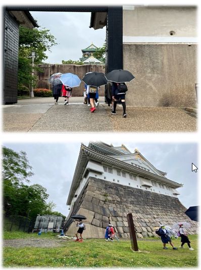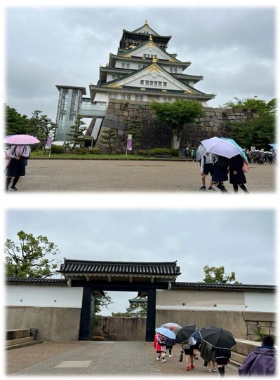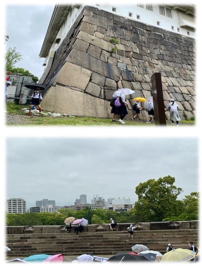 ピース大阪の見学の後、大阪城に行きました。小雨の中でしたが、大きな石垣など、お城周辺を見学しました。