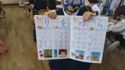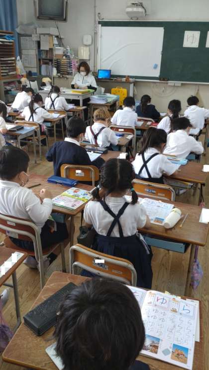 ひらがなの学習をしました。この時間は、新しく「ら」「ゆ」のひらがなについて学んでいます。ドリルを使って、丁寧になぞったり、形を整えて書いたりして練習しています。