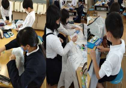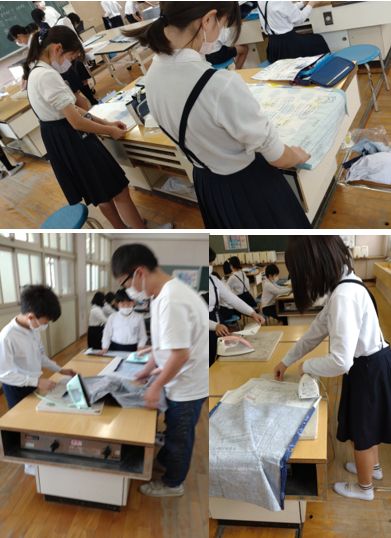 エプロンづくりに取り組んでいます。この時間は、布を折って、まち針でとめた後、アイロンをあてて、しつけ縫いをしています。