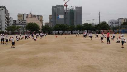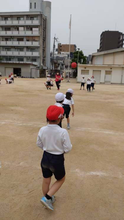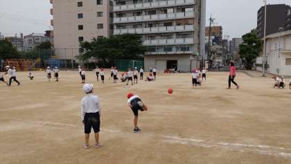 ボールを使った運動をしました。自分の狙ったところに投げられるように友だちとキャッチボールしています。