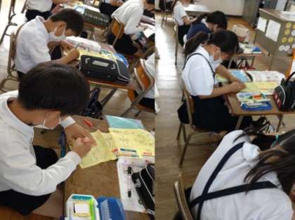 手ぬいの学習に取り組みました。玉結び・玉どめ・なみぬい・返しぬい・ボタン付けが正しく安全にできるように取り組んでいきます。