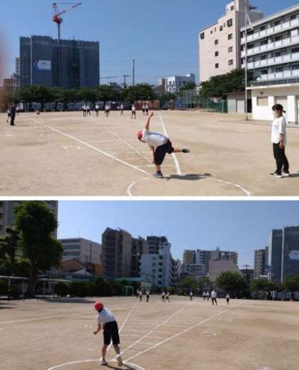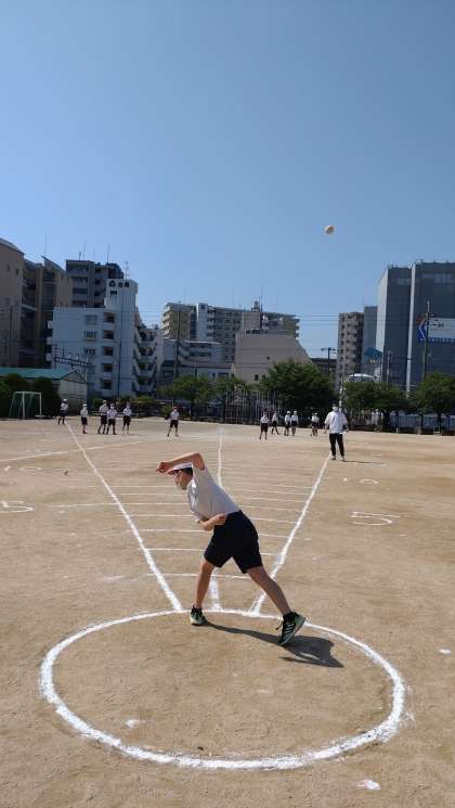 新体力テストのソフトボール投げに取り組みました。投げるボールの角度も意識しながら、全力で投げています。