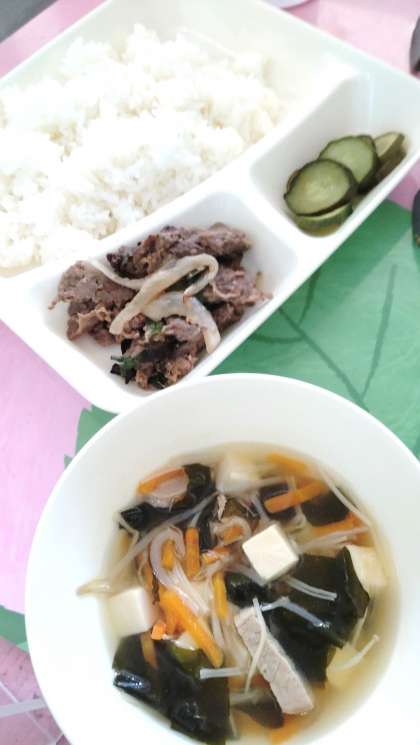 今日の給食は、プルコギ、とうふとわかめのスープ、きゅうりの甘酢づけ、ごはん、牛乳です。