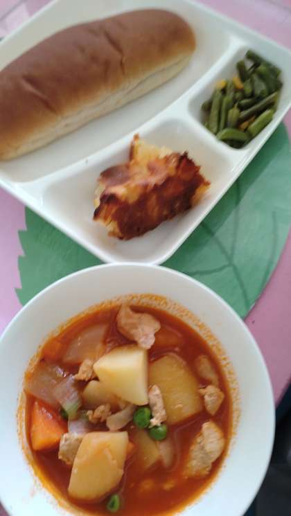 今日の給食は、ケチャップ煮、さんどまめとコーンのソテー、りんごのクラフティ、パン、牛乳です。