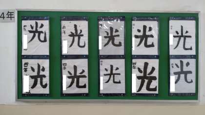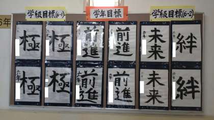 写真は、4年生と6年生の書写の作品です。6年生は、学年・学級目標を漢字で書きました。4年生も6年生も力強く書いています。