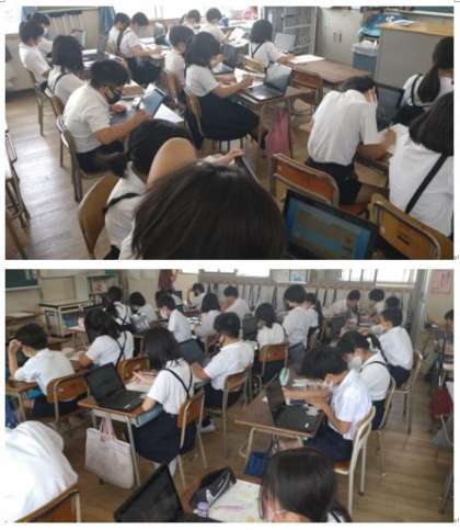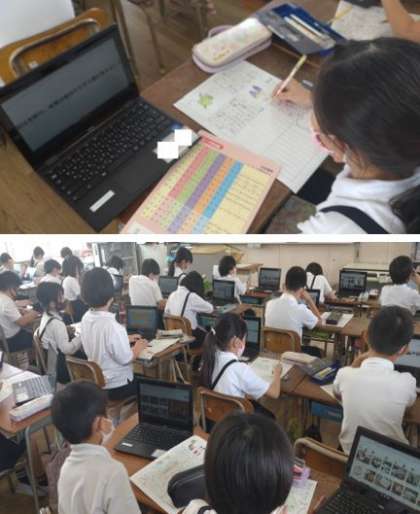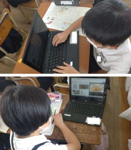 パソコンを活用して、新聞づくりに取り組みました。世界の国々について調べています。世界遺産や特産品など、いろいろな視点から記事にしています。