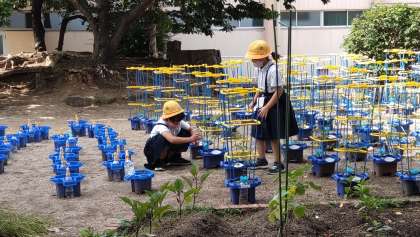 朝、登校すると、低学年の子どもたちは、アサガオやミニトマトの水やりを自分たちで主体的にしています。