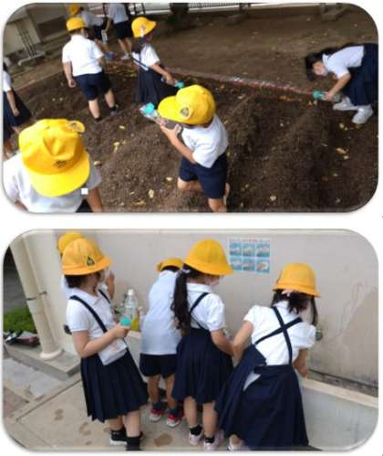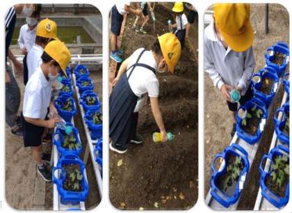 学習園に水やりと観察に行きました。葉っぱが大きくなって、子どもたちは大喜びです。植物の成長をお世話をしながら、しっかりと見つめていってほしいと思います。