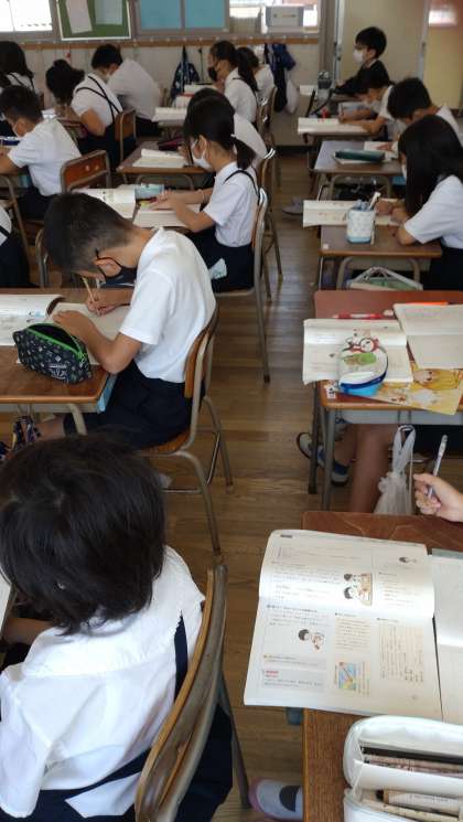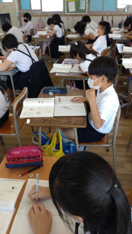 「環境問題について報告しよう」の学習をしています。集めた資料を活用し、引用したり図表やグラフなどを用いたりして、自分の考えが伝わるように書き表し方を工夫して書けるように学習していきます。