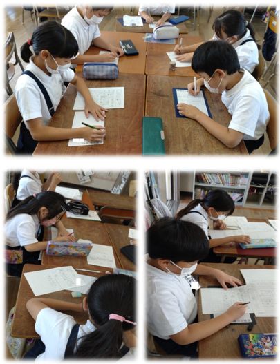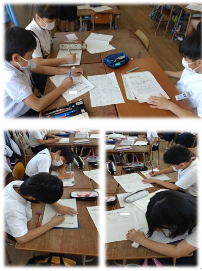 「みんなで新聞を作ろう」の学習をしています。グループで、書く内容の中心を明確にし、文章の構成を考えています。