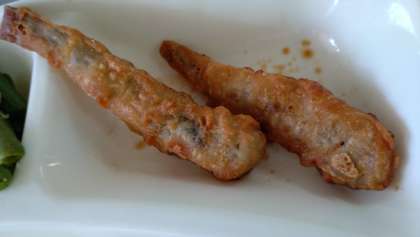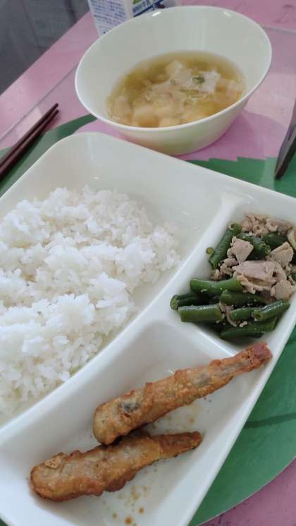 今日の給食は、いわしのてんぷら、五目汁、豚肉とさんどまめのいためもの、ごはん、牛乳です。