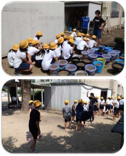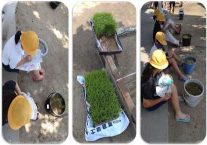 5年生が、お米づくりに取り組みました。バケツ稲づくりです。バケツで稲を育てていきます。