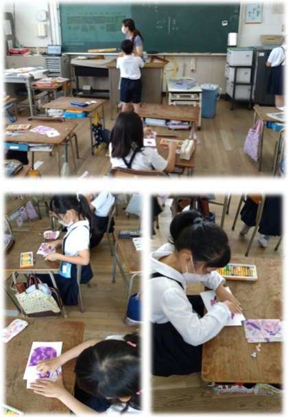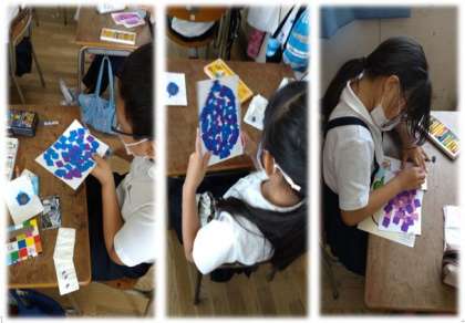 「あじさい」を描画しました。花びらを1枚1枚丁寧に彩色しています。子どもたちの描いた「あじさい」がきれいに咲いています。