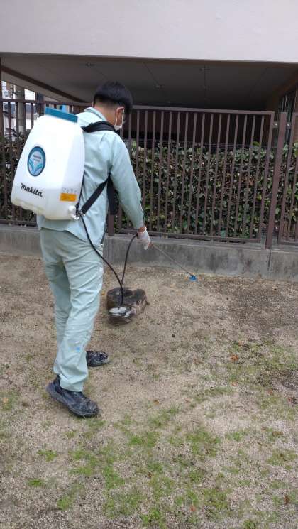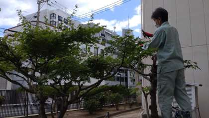 夏になると雑草が多くなります。写真は、管理作業員さんが、剪定や除草作業をしている様子です。夏に向けて、学校の環境整備に取り組んでいます。