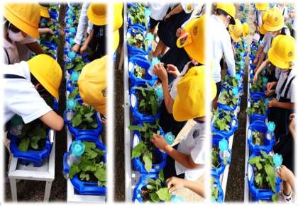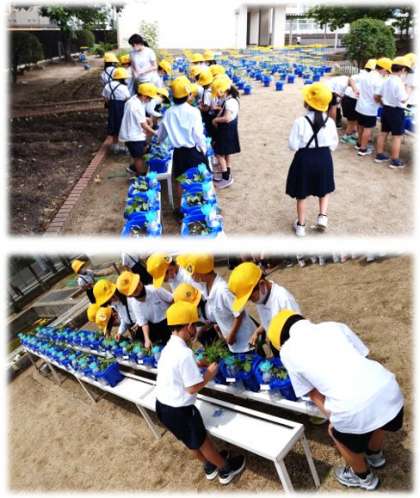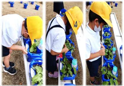 アサガオのお世話をしています。雑草をぬいたり、肥料をあげりしました。どの活動もとても真剣に取り組んでいます。