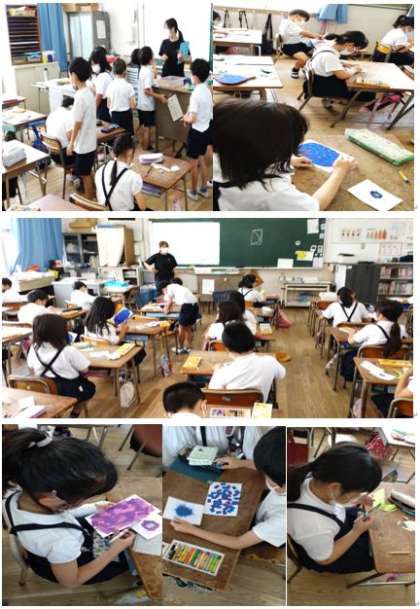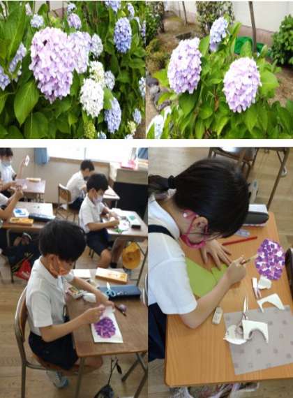 「あじさい」を描画しました。上の写真は、学校に咲いている「あじさい」です。子どもたちは熱心に花びらや葉を丁寧に彩色しています。