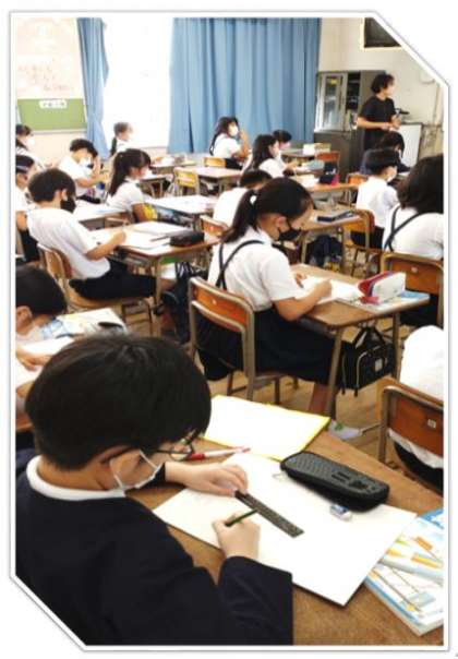 「小数のわり算」の学習をしました。図を用いるなどして数量の関係に着目し、小数でわる式の意味を考えたり説明したりして文章問題の課題を解決しています。