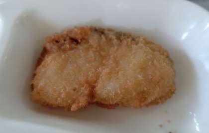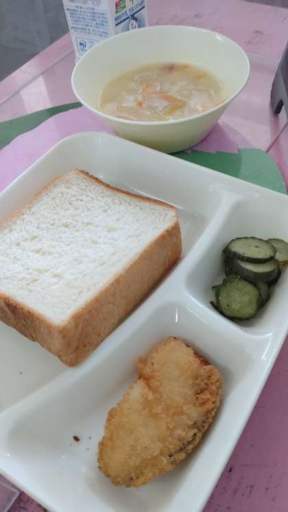 今日の給食は、サーモンフライ、豆乳スープ、きゅうりのバジル風味サラダ、パン、牛乳です。写真は、サーモンフライです。