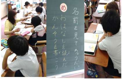 物語文の感想を描きました。作品の中でおもしろかったことや心に残ったことを文章表現しています。先生との対話の中で、自分の思ったことを確かめて文にしていきます。