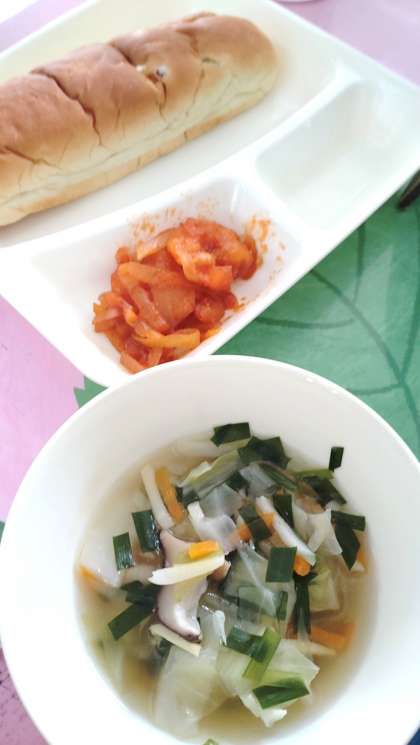今日の給食は、えびのチリソース、中華スープ、ヨーグルト、パン、牛乳です。