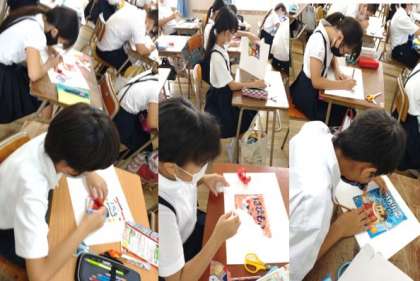 「おかしな?パッケージ」の作品づくりをしています。いろいろなお菓子のパッケージの一部を使って、残りの部分を描画しています。