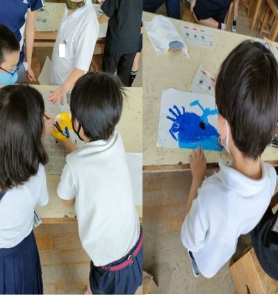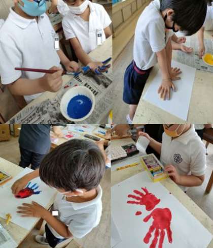 毎週金曜日は、なかよしタイムがあります。この時間は、手形を使った描画に取り組みました。自分の手形が、いろいろな絵に広がっていきます。子どもたちは、とても楽しく創作活動を行っていました。