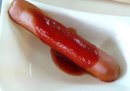 ※今日の給食では、ゆでたウインナーソーセージにケチャップ味のソースをかけています。