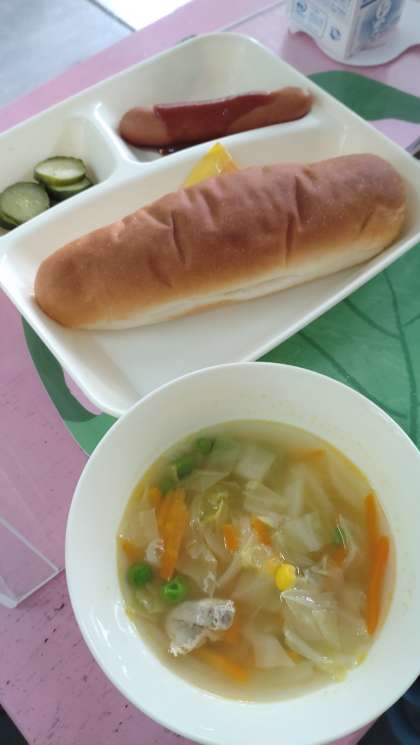 今日の給食は、ウインナーのケチャップソース、スープ、きゅうりのサラダ、パン、牛乳です。