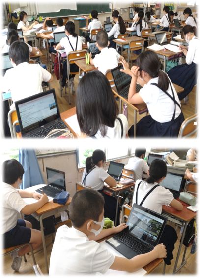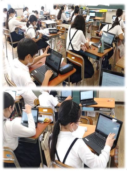 調べるテーマについてパソコンを活用して情報を集めています。集めた情報を整理して、伝えたいことを明確にしていきます。