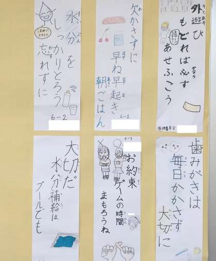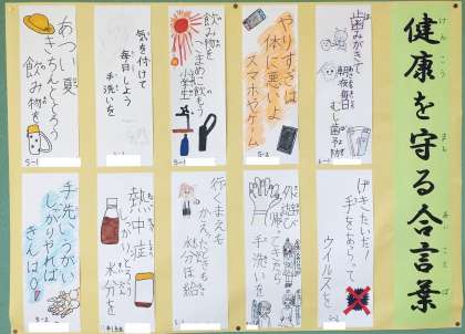 保健委員会の子どもたちが、「健康を守る合言葉」を考えました。子どもたちが、健康についてよく考えた合言葉が保健室前に掲示してあります。