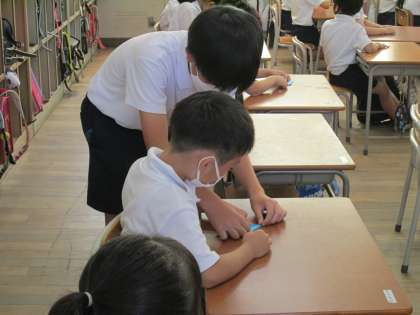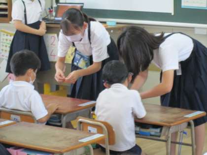 6月23日(木)折り鶴集会がありました。6年生の平和についての発表の後、6年生の児童が1〜5年生の各教室に行って、折り鶴の折り方を教えに行きました。全校児童が折り鶴を一生懸命折りました。本日折った折り鶴は、9月の広島への修学旅行で6年生が平和記念公園の「原爆の子の像」に捧げます。