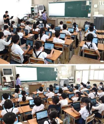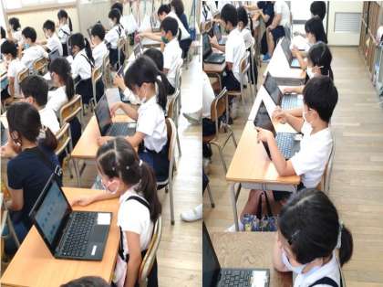 2年生が一人一台端末PCで、アプリケーションソフトを操作しました。発表ノートのアプリケーションソフトで、自分の写真挿入したり文字を入力したりしています。