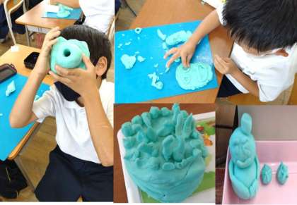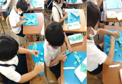 粘土の造形活動に取り組みました。2年生になってはじめての粘土の作品づくりです。子どもたちは思い思いに楽しい作品を創作しました。