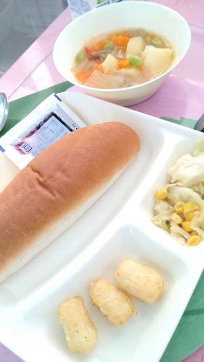 今日の給食は、いかてんぷら、フレッシュトマトのスープ煮、サワーソテー、パン、牛乳です。