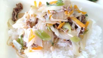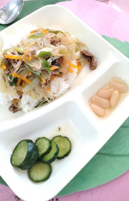 今日の給食は、牛丼、きゅうりのしょうがづけ、大福豆の煮もの、牛乳です。