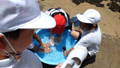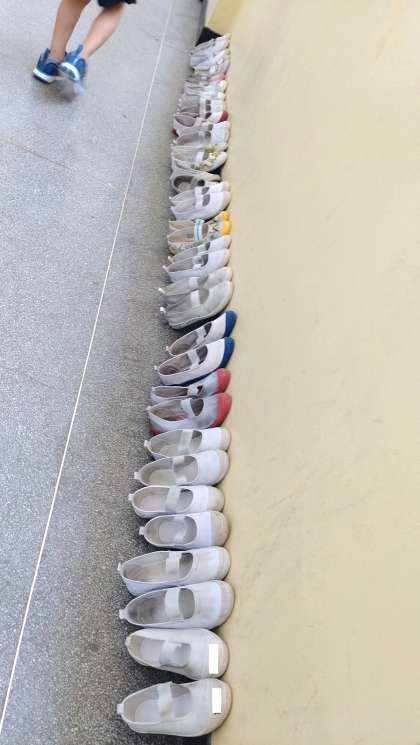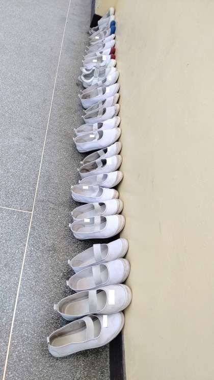 生活科で、上靴をみんなで洗いました。きれいになった上靴が教室前に並んでいます。