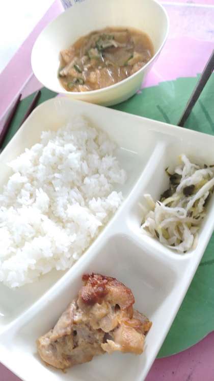 今日の給食は、鶏肉のしょうゆマヨネーズ焼き、とうがんのみそ汁、切り干しだいこんのゆず香あえ、ごはん、牛乳です。