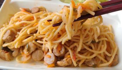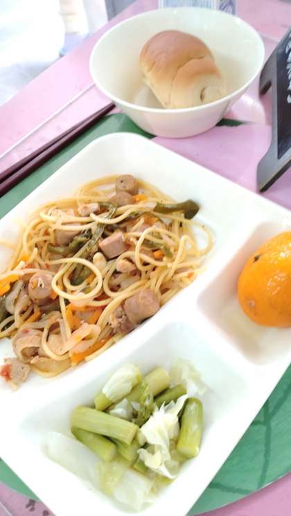 今日の給食は、チキントマトスパゲティ、グリーンアスパラガスとキャベツのサラダ、みかん(冷)、パン、牛乳です。