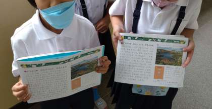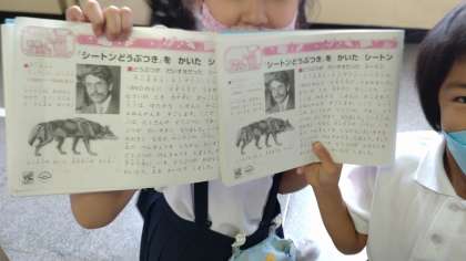 休憩時間に、1年生の子どもたちが校長室に訪ねてきました。「校長先生、ノートにシートンが載っています。」との報告。よく見せてもらうと、算数のノートに、シートンの業績やシートン動物記のことなどが詳しく紹介されていました。以前のファーブルのように、子どもたちは、全校朝会での話をよくきいていたのですね。素晴らしいと思います。図書館でシートン動物記を読んだ話もしてくれました。写真は、にこやかにノートを見せてくれる子どもたちの様子です。