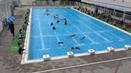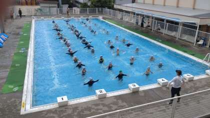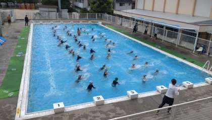 3年生のプールでの学習の様子です。水慣れの後、『けのび』や『伏し浮き』などの泳ぎの基本を学んでいます。