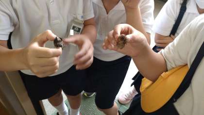 休憩時間に校長室にノックの音。2年生の子どもたちが運動場で発見したセミとセミのぬけがらをニコニコしながら見せにきてくれました。写真を撮った後に、子どもたちはセミを運動場の木にもどしに行きました。