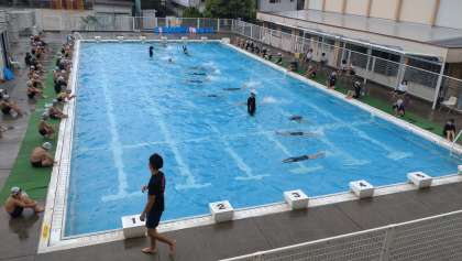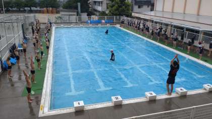 4年生、プールでの学習の様子です。写真は、けのびやバタ足などの基本練習をしている様子です。