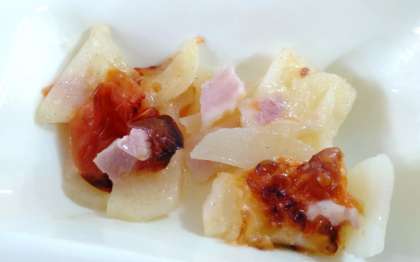 ベーコン、じゃがいも、トマトの上にチーズをのせて焼きます。焼くことでトマトの酸味がやわらぎ、チーズ、じゃがいもともよく合います。