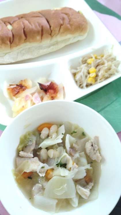 今日の給食は、鶏肉とてぼ豆のスープ煮、じゃがいもとトマトのチーズ焼き、もやしとコーンのソテー、パン、牛乳です。