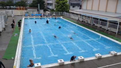 4年2組のプールでの学習の様子です。「けのび」「伏し浮き」「バタ足」の基本練習から、25メートルプールのたてを使って、それぞれの課題に取り組んでいます。