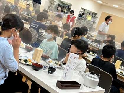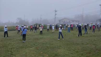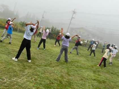 霧が濃い朝となりましたが、体操をして朝食もしっかりといただきました。