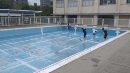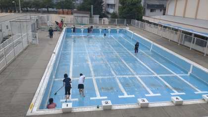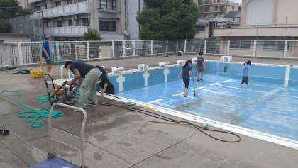 長かった夏休みも終わり、いよいよ明日、8月25日(木)に2学期の始業式が行なわれます。写真は、教職員がプールの清掃に取り組んでいる様子です。プール納めは、9月8日(木)で、それまで、子どもたちがプール水泳に安全に取り組めるように準備をしています。