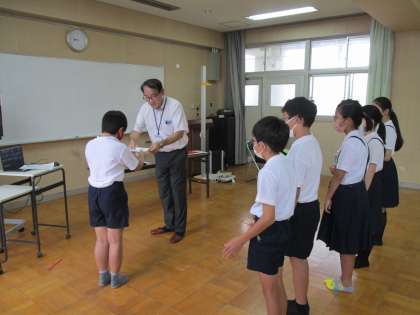 本日から2学期が始まりました。始業式に先立ち、8月4日に行われた児童水泳記録会に参加した児童の紹介と、及び代表者に記録証の授与をしました。引き続き行われた始業式では校長先生から「目標をもって、挑戦しましょう。悩みがあれば先生たちに相談しましょう。規則正しい生活を送り体調を整えましょう。」等の話がありました。また児童代表の言葉として4年生の2名が、1学期頑張ったこと、2学期に頑張りたいことを発表しました。
