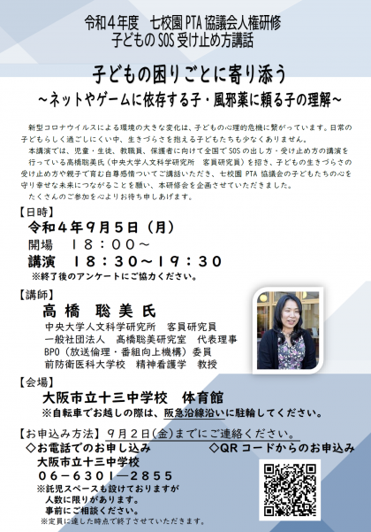 「7校園PTA協議会人権研修 子どものSOS受け止め方講話」のお知らせ